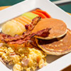 A homey breakfast with fresh local fruit, pancakes and scrambled eggs